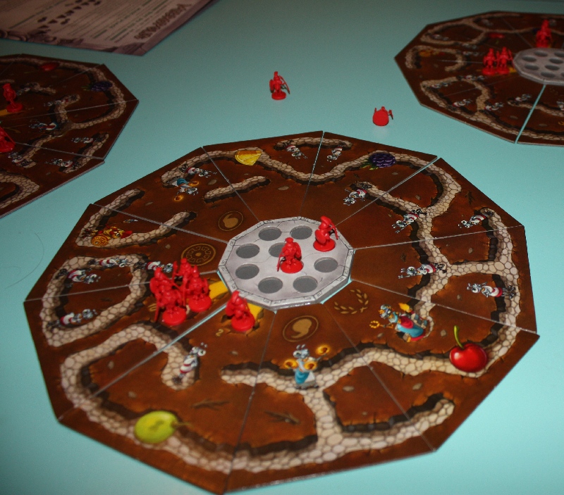 Chacun son tour, on choisit une tuile parmi 7, disposées dans l’ordre. On doit payer une fourmi ouvrière par tuiles que l’on refuse. Ce principe aussi utilisé dans Majesty, Century et d’autres jeux plus ancien fonctionne toujours bien. Les fourmis permettent de choisir plus loin, mais aussi de marquer des points. Ainsi, chaque tuile permet de réaliser une belle série de galerie.