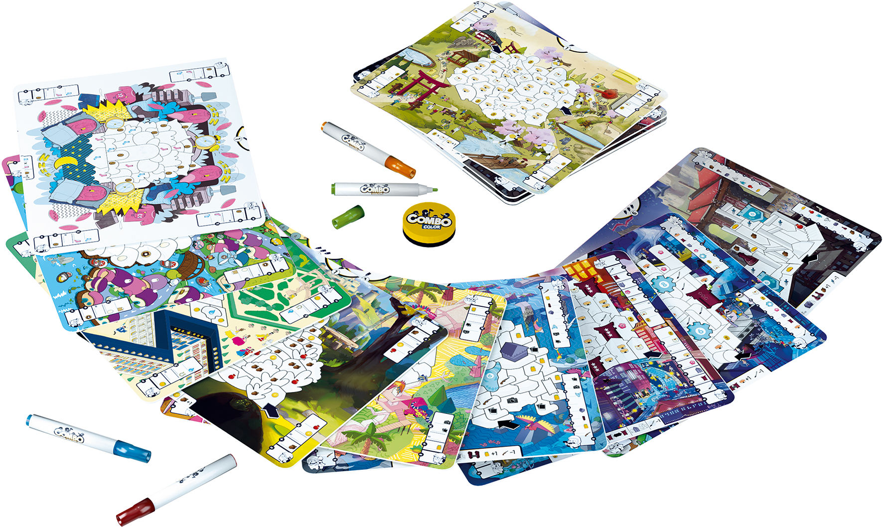 - 4 feutres effaçables de couleurs différentes, 18 plateaux de jeu recto-verso pour 36 aventures dans 6 univers, 1 effaceur et 1 règle du jeu.