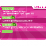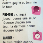 - 4 modes de jeu : ping pong (plusieurs réponses à donner données alternativement par les joueurs), cible (la réponse est chiffrée), chrono (être le plus rapide à répondre), chance (questions loufoque ou qui font appel au hasard)