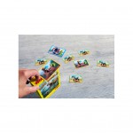 - 1 boîte de jeu (= rocher pour le saut des dinos), 4 pions en bois, 52 cartes de dinos de cinq tailles différentes : 4 x T-Rex (violet), 8 x spinosaures (rouge), 8 x dilophosaures (bleu), 16 x vélociraptors (jaune), 16 x archéoptéryx (vert), 1 règle du jeu.