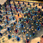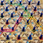 À son tour un joueur peut soit prendre des cartes, soit payer des cartes correspondantes aux couleurs des picots du plateau 3d qu’il veut utiliser pour créer une zone de contrôle avec ses élastiques. Une fois cette zone créée il pourra récupérer les ressources ou point de victoire contenu à l’intérieur.