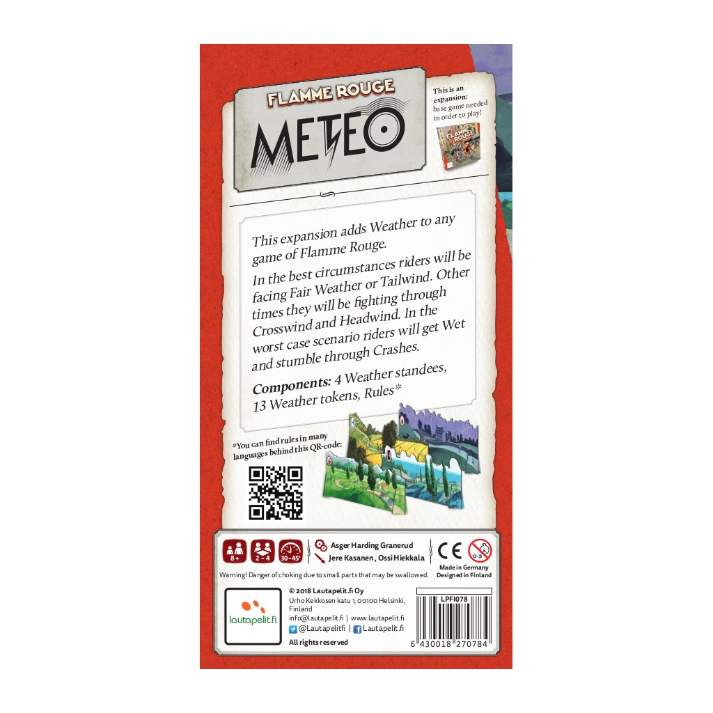 Avec un peu de chance les coureurs feront route avec un soleil clément ou même mieux avec un vent arrière. Mais d‘autres fois, ils devront supporter des vents de travers ou des vents de face qui les ralentiront. Dans le pire des cas, ils affronteront la pluie et les coureurs risquent alors d‘enchaîner les chutes. Ce jeu est une extension : le jeu de base Flamme rouge est requis pour jouer !