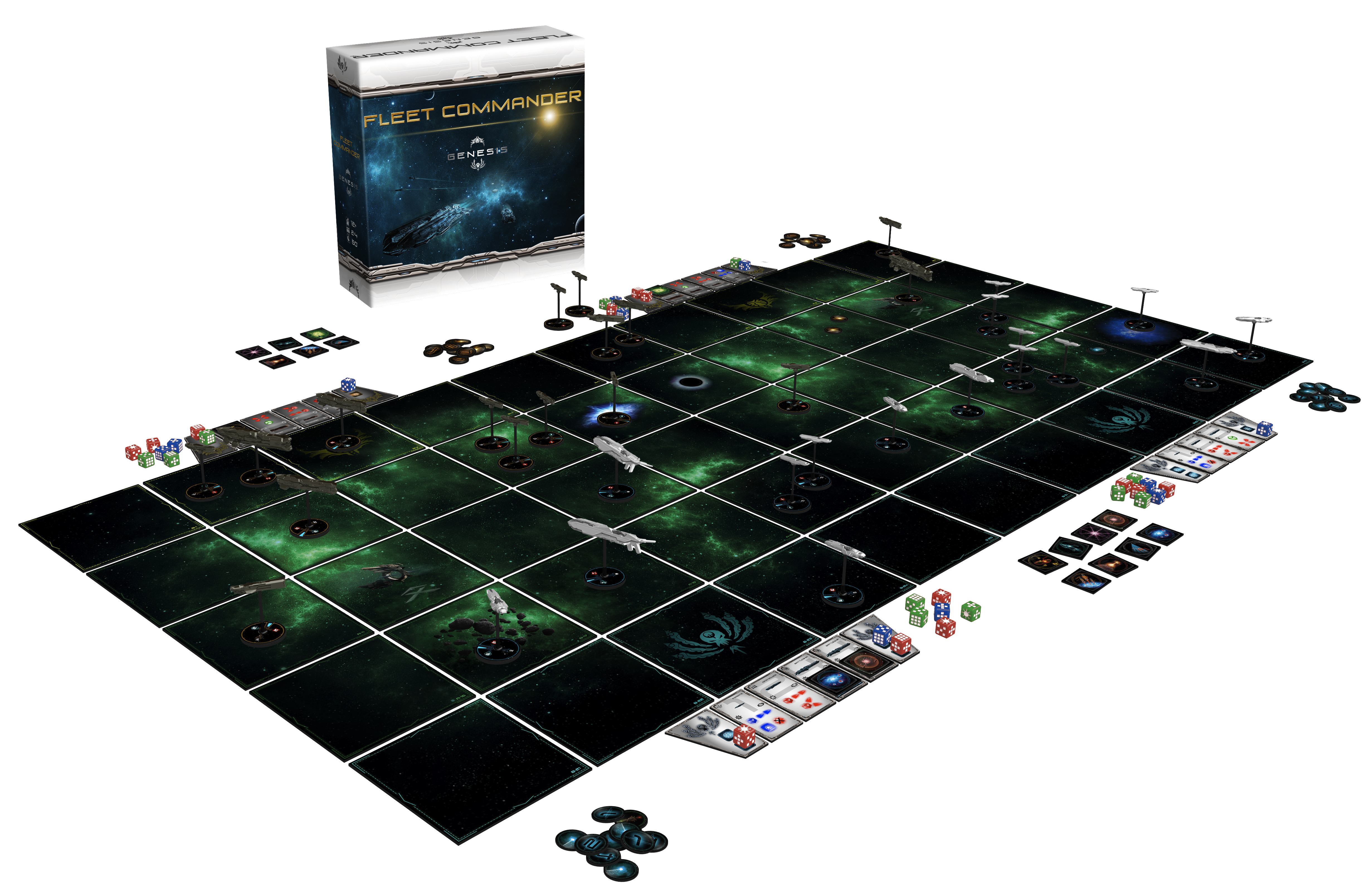 - Fleet Commander – Genesis » contiendra l’équivalent de deux boîtes de « Fleet Commander 1 - Ignition » et d’une extension « Beyond the Gate » (sortie en octobre 2015), soit 32 figurines et 36 dés ainsi que du matériel amélioré avec notamment 50 tuiles pour confectionner les plateaux de jeu