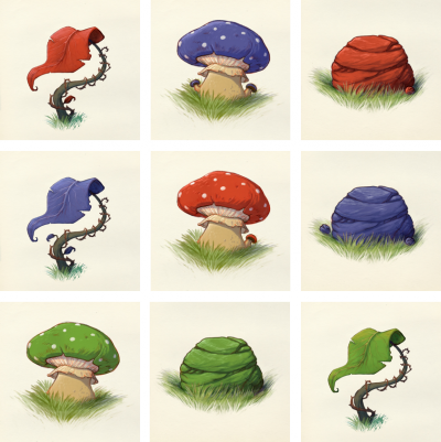 Sur la table vous disposez une "grille" de 3x3 cartes forêt : elles représentent toutes d'un côté et de l'autre des éléments différents : 3 motifs: « champignon », « feuille » et « caillou », en trois couleurs : jaune, rouge et bleu.