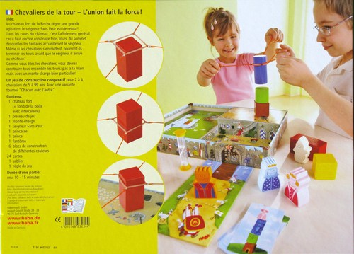 Il s'agit d'un jeu coopératif ou du moins d'équipe, ou le principe est de construire des tours à l'aide d'un élastique rond sur lequel sont attachés 4 ficelles. Chaque joueur tient un bout de la ficelle et va devoir, avec beaucoup de doigté (tout l'intérêt du jeu est là) transporter les unes après les autres, des pièces en bois sur le château afin de monter une tour déterminée à l'avance par une carte.