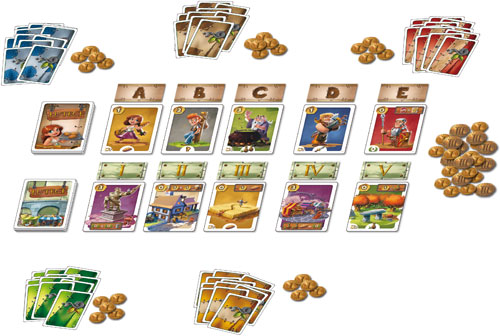 À la fin du tour, quand tout le monde a récupéré une ou deux cartes du marché, on recomplète ce dernier avec des nouvelles cartes Personnage / Bâtiment. Les cartes qui n'ont pas trouvé preneur se verront lestées d'une piécette. Elles deviennent ainsi plus intéressantes : si vous en achetez une de la sorte, la piécette sera pour vous ! Certaines cartes un peu délaissées finiront par devenir très désirables car plus elles resteront en jeu et plus elles auront de la valeur, gagnant une pièce par tour.