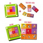 Dans Mindo, Il faudra tourner et retourner les tuiles recto-verso jusqu’à reconstituer le motif coloré de la carte défi. Une seule solution est possible…