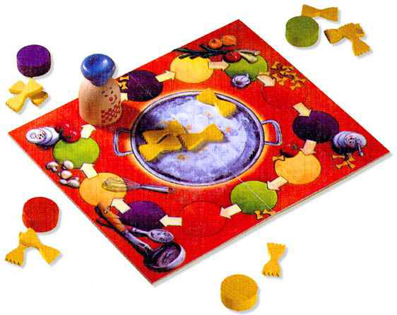 - 1 plateau de jeu 1 pion cuisinier 4 pions aide-mémoires 12 nouilles en bois 1 règle du jeu