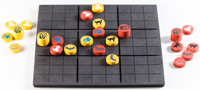 - Trois pions Fantôme : Ils peuvent se déplacer n'importe où sur le plateau, en respectant, tout comme tous les autres pions, la contrainte de chainage.