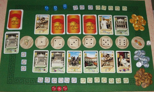 Quand on joue des cartes de sa main, on les attribut à un disque dé, en payant le prix en sesterces indiqué sur la carte. Si une carte est déposée en face d'un disque à dé où se trouve déjà une carte, la carte ancienne est mise sur la pile des cartes rejetées.