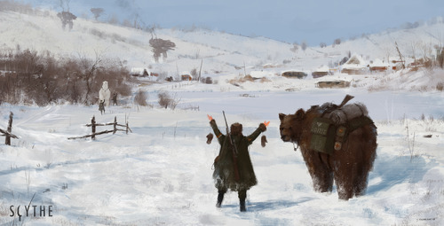 L'histoire se déroule dans une ambiance victorienne, ponctuée d'élément punk. Le côté industriel du jeu, avec la présence de mines, d'usines, d'ouvriers et de Mechas apporte énormément à l'atmosphère de Scythe et rend le jeu unique. Les illustrations sont de Jakub Rozalski.