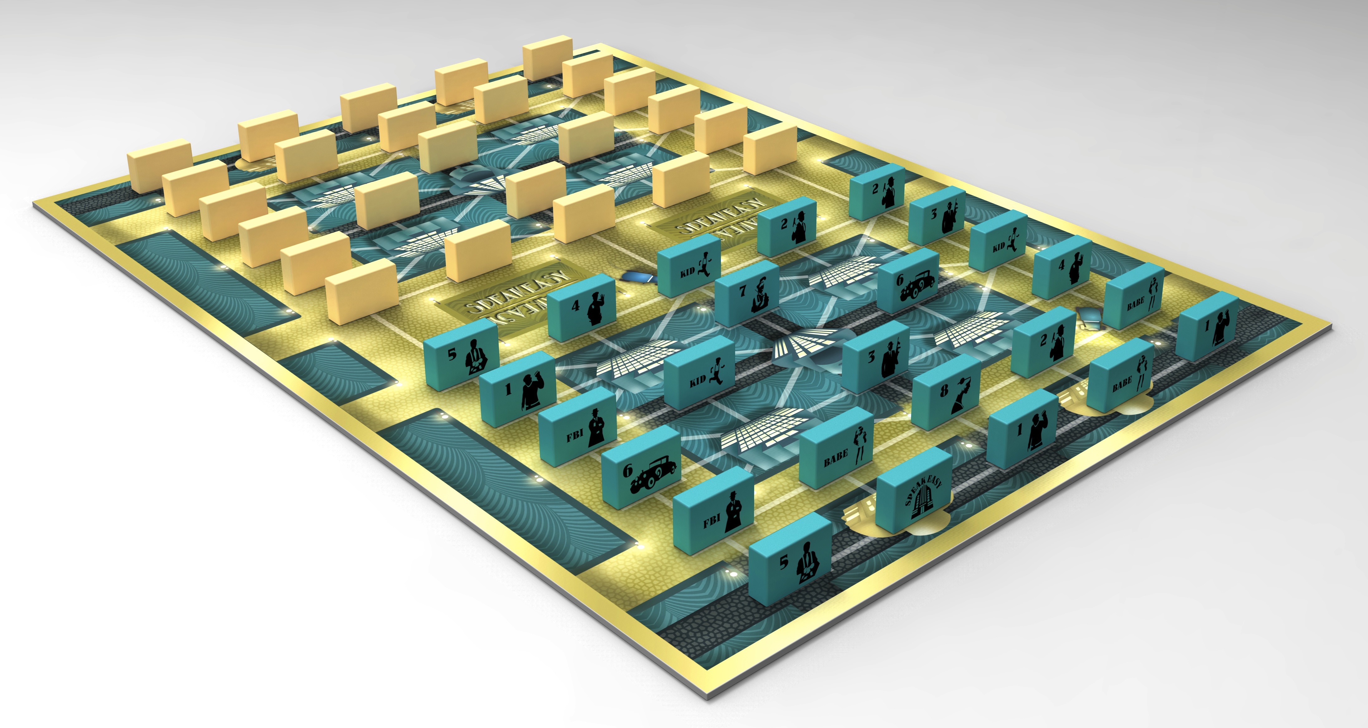 Placez judicieusement vos pièces ! Ne bloquez pas vos pièces importantes et arrangez vous pour que les bonnes pièces soient libres au bon moment. Faites aussi attention à ce que votre adversaire ne devine pas où se trouve votre Speakeasy juste en suivant la façon dont vous posez vos pièces sur le plateau. Une fois que toutes les pièces sont posées, le joueur qui commence peut faire son premier mouvement.