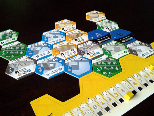 Les tuiles hexagonales arrivent une à une sur le marché. Plus vous prenez le risque d’attendre avant de les acheter, moins elles couteront cher (de 10$ à 0). Une tuile achetée doit être posée à côté de celles que vous avez déjà placées devant vous. Il faut procéder précautionneusement car les tuiles interagissent entre elles. Un parc fait par exemple grimper d’1 votre réputation par tuile qu’il touche ; un parking et un immeuble qui se touchent font grimper vos revenus…