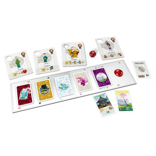 - • 6 cartes Calligraphies • 6 cartes Cerisiers • 1 dé de Fortune • 6 tuiles Voyageurs