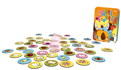 Devant vous des tuiles réversibles représentant des moitiés de fruits : chaque joueur en choisit une. Votre but est de ramasser un maximum de ces tuiles en empilant rapidement les faces de fruits identiques. Comme tout le monde joue en même temps, il faut observer vite et bien pour réaliser la plus haute pile ! Tutti frutti est un jeu ultra vitaminé pour réveiller vos réflexes et apporter de la bonne humeur à votre table : un cocktail de fruits à consommer sans modération.