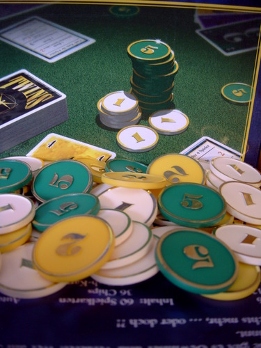 Chaque joueur reçoit ensuite trois jetons 1, deux jetons 2 et un jeton 5. Les autres jetons sont rangés dans la boite.