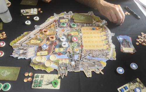 Entre Honshu et Kingdomino (mais en très simple), Un dernier donjon… est très interactif et bien méchant : on pourra recouvrir le terrain des autres avec nos cartes, le couper, placer des dragons, annexer des zones avec les ponts, protéger son royaume, ou parier sur un des ses fiefs qui vaudra plus de points. Très simple, Un dernier donjon… me semble être LE jeu familial joué pendant cette journée. C’est même plus simple que Grandbois, qui suit un peu le même principe.