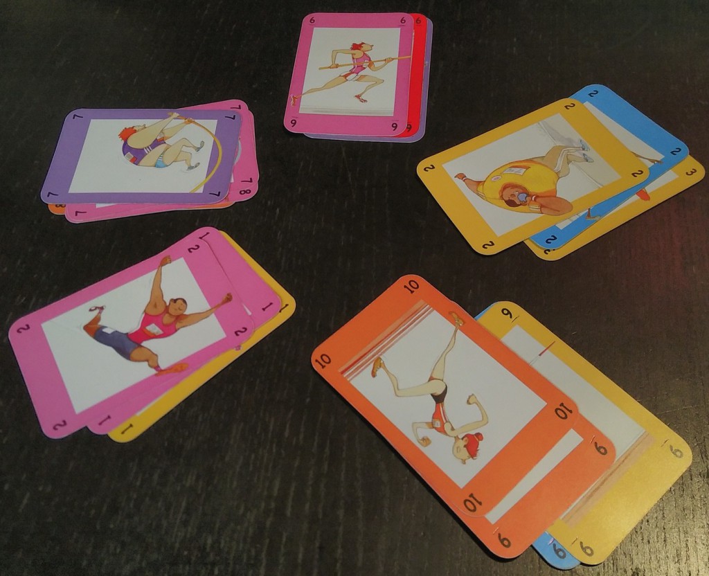 Cette fois, on a un jeu pour les un « peu plus grands ». Les joueurs auront une main de cartes, et le but sera de réussir à toutes les jouer pendant son tour de jeu. Il y a quelques règles pour placer ses cartes sur les 5 paquets présents sur la table : on pourra placer une carte sur une autre de même valeur, ou d’une valeur de plus ou moins 1 si les deux cartes ont la même couleur.