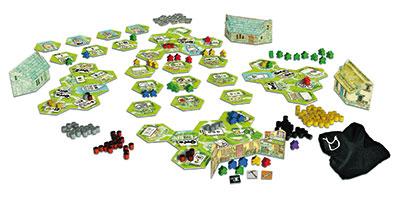 La boite contient : 64 tuiles hexagonales, 120 jetons ressource (made in bois) 140 travailleurs (made in bois), 1 marqueur premier joueur, 6 écrans, 1 sac textile, 12 sachets zip, 1 règle of course.