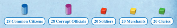Les petits cubes vont symboliser des citoyens (simples citoyens, marchands, fonctionnaires, soldats et clercs ont tous des tailles et/ou des formes différentes, formes que vous pouvez palper dans votre sac avant de piocher) des citoyens du royaume donc, que vous allez exploiter sans pitié – ou presque – le tout pour gagner des points de victoire. Vous êtes vraiment un de ces membres de l’aristocratie qui donne envie de couper des têtes vous savez ?