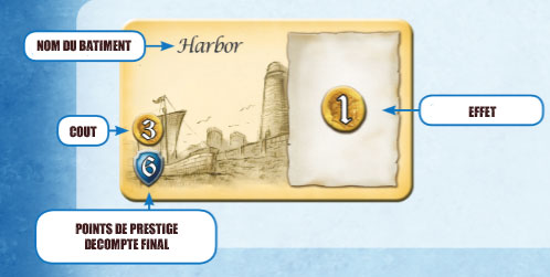 Au début de chaque tour sauf le dernier, on va découvrir 6 nouvelles cartes bâtiments. Puis on déterminera l’ordre des joueurs (celui qui a le plus de points de prestige commence). Quand c’est à vous, vous pourrez :