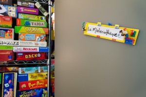 Quand nous l’avons contactée pour parler orthopédagogie, elle nous a gentiment invité dans son cabinet pour parler de la pédagogie par le jeu… Quand je suis rentrée chez elle, je me suis crue dans mon salon, avec ma ludothèque. Je suis restée bouche bée. Mon cerveau était en ébullition. Elle faisait ce que je rêvais de faire.