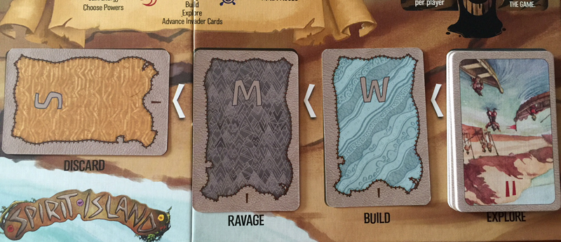 Les Esprits jouent en même temps, tâchant d’améliorer leur main de cartes, leur capacités spéciales et leur présence sur le terrain. Puis, ils utilisent leurs actions pour démoraliser l’envahisseur, le contenir ou lui donner envie d’aller voir ailleurs si c’est pas mieux. Voire, ils l’éradiquent avec moins de paraphrases. Ensuite, ces derniers réagiront impétueusement dans un soubresaut d’orgueil complaisant, selon un schéma connu mais évolutif. Après quoi, les joueurs auront de nouveau l’opportunité de rebondir (et je ne dis pas « rebondir » parce que j’écris cet article assise sur une balle. Enfin, si peut-être, un peu).
