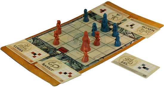 À son tour, un joueur doit déplacer 1 de ses pions selon le déplacement indiqué par 1 de ses 2 cartes, donner sa carte jouée et la placer entre les 2 joueurs, en attente, et récupérer celle qui était déjà sur le côté. Puis l’autre joueur fait de même : jouer une carte, déplacer 1 pion selon le mouvement indiqué, placer la carte jouée entre les 2 joueurs et récupérer celle qui était en attente, celle jouée par son adversaire au tour précédent. Bien sûr, 1 pion peut bouger au dessus des autres pions, ne peut pas sortir du terrain, ne peut pas atterrir sur une case déjà occupée par 1 de ses autres pions mais peut atterrir sur une case occupée par 1 pion adverse pour le capturer. Comment gagner ? Soit votre pion maître prend le contrôle de l’arche adverse (la case de départ du pion maître), soit n’importe quel pion capture le pion maître adverse. Le tout aussi pour fin juin 2017, à une trentaine d’euros cette fois-ci.