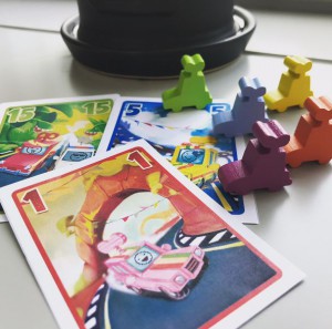 Lorsque vous gagnez un pli, vous avancerez d’un nombre de cases équivalent à la valeur de carte jouée la plus petite. Une seule voiture avancera par pli ! Les autres voitures, à l’arrêt pendant ce tour, en profiteront pour faire tourner leur petit mécanisme d’une valeur (elles s’étendent de 1 à 16).