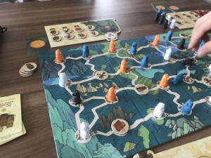 Les mouvements que vous effectuerez sont définis par deux mécaniques différentes : la première, le résultat d’un affrontement par cartes type jeux de pli, la deuxième, une mécanique que les anglophones nomment catch-up, qui vous permettra de bénéficier d’avancées très importantes sur le plateau.