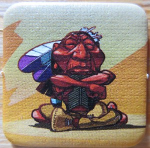 La première, on s’en doute, sera tout simplement de poser une carte. D’ailleurs, pour rester dans la simplicité, le premier à ne plus avoir de carte en main gagne la partie. Ces cartes posées symbolisent des danses pour honorer les divinités animales. Pour poser il faudra d’abord déplacer le meeple indien sur un jeton animal adjacent et poser une carte correspondant au jeton sur lequel il se trouve. Bon, comme on pose la carte face cachée on peut le faire ou pas. C’est là que commence le bluff.