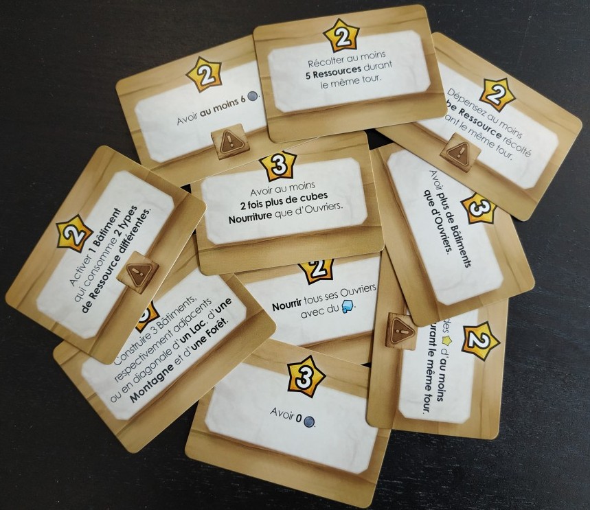 Lorsque tous les joueurs ont posé tous leurs ouvriers, la fin de manche arrive, les bâtiments à effets spéciaux sont activés (ils sont signalés par un symbole chronomètre), les Ouvriers sont récupérés et doivent être nourris à raison d’une ressource alimentaire par Ouvrier (non non, ils ne se satisferont pas de cailloux ou d’écorce de bois, bande de tyrans !). Pour chaque ressource manquante… vous perdez 3 points, et outch ça fait mal !