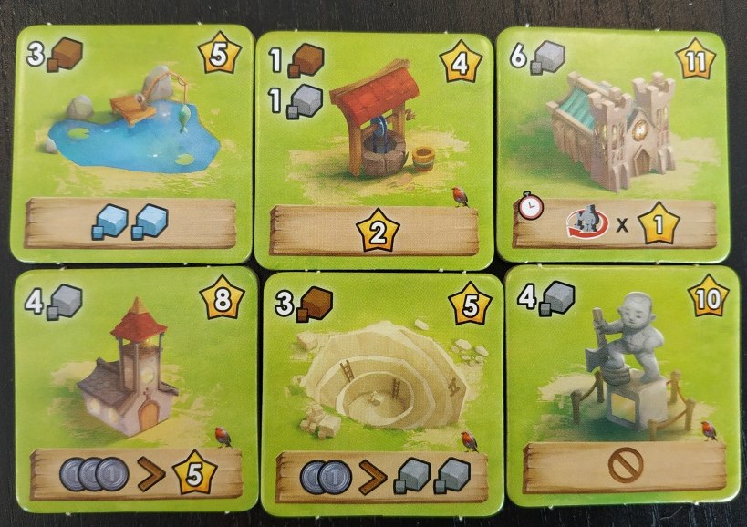 Chaque Bâtiment possède un coût (en bois et/ou pierre, en haut à gauche), des points de victoire (en haut à droite, à scorer immédiatement) et un effet.