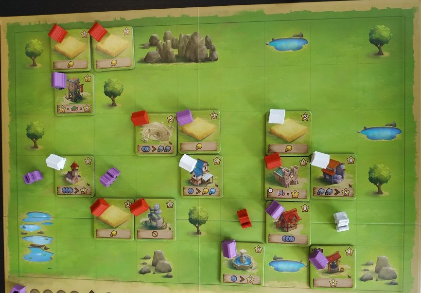 Le matériel est de bonne qualité, coloré avec de nombreux meeples, on regrettera un peu les simples cubes qui tiennent lieu de ressources, mais notons que les Ouvriers et les Bâtiments sont des meeples customs. L’ensemble visuellement est très agréable, grâce aux illustrations (de Sabrina Miramon) arrondies type cartoon et le côté très aéré du plateau et des tuiles. Ce graphisme un peu enfantin et épuré peut faire craindre un jeu trop simple et creux, mais il n’en est rien.