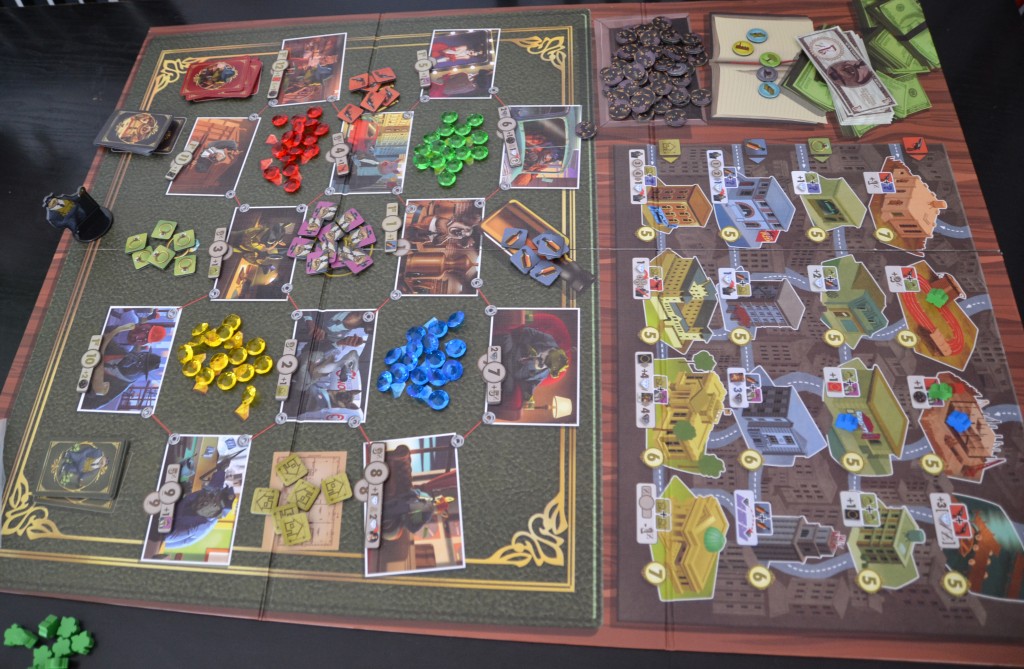 J’ai à l’inverse un peu moins apprécié l’illustration du plan de la ville, présent sur le plateau. Ce dernier est clairement un ton en dessous du reste, un peu terne et sans vie, et ne m’a pas séduit plus que cela. Mais on ne passe finalement assez peu de temps à regarder ce plan de la ville, contrairement au reste des éléments du plateau, qui eux sont très bien illustrés très clairs, et surtout ou chaque élément à sa place dédiée une fois mis en place.