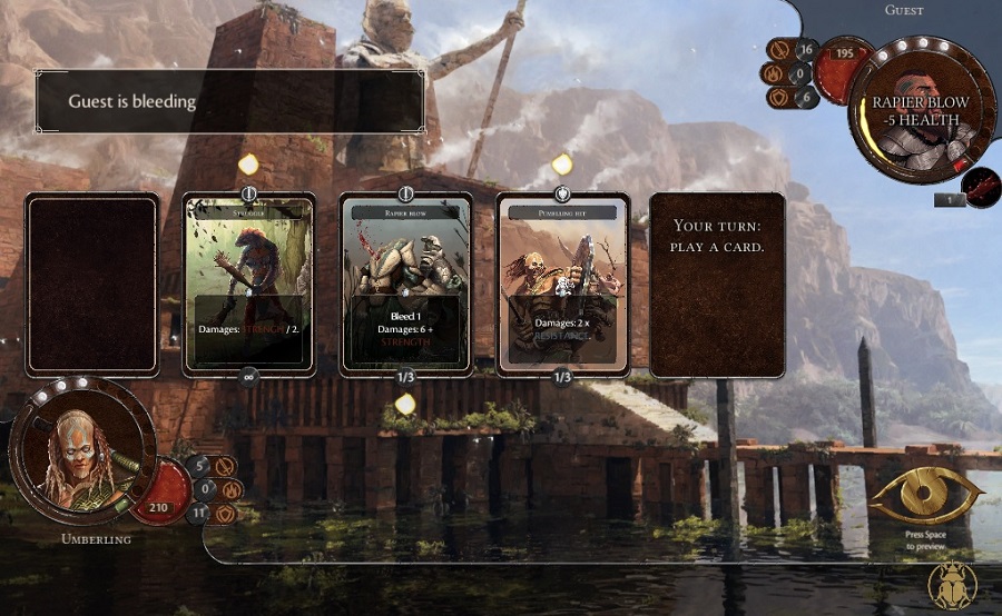 Donc, les joueurs enchaînent les cartes, qui s’activent petit à petit, jusqu’à ce que mort (virtuelle) s’ensuive. C’est vraiment tout, oui. Mais la micro-gestion de votre héros et de ses différentes capacités s’en trouve décuplée. Souci immédiat : vous jouez à l’aveuglette, ou presque, contre le deck de l’adversaire. Pour quand garder mon précieux bouclier ? En effet, certaines cartes s’activeront dès le tour où on les joue. On déroule la combo de son deck au mieux, en parant aux urgences de temps en temps. Par exemple, on pourrait avoir un deck basé sur les saignements (qui permettent de renforcer des cartes ou déclencher des combos) : ainsi ce qu’on fait dans ce genre de partie ressemble à “je te fais saigner, tu me tapes je te fais saigner, tu me retapes, ah, je commence à être bas en vie, je m’ajoute donc vol de vie pour transférer ta santé vers la mienne, tu me tapes, je te fais saigner… Un brin répétitif. Cependant, il s’engage une véritable guerre d’attrition, où l’on essaie de minimiser les techniques les plus fortes de son adversaire tout en optimisant les siennes. Car si la bataille dure trop on sera réduit à une sélection d’action beaucoup plus limitée.