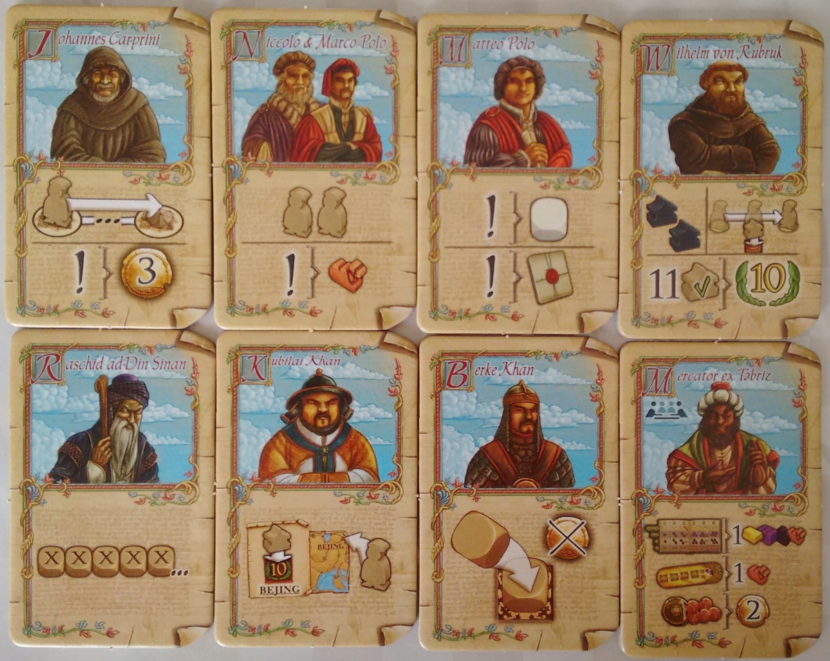 - Matteo Polo : il dispose d’un sixième dé (blanc), et reçoit un contrat supplémentaire à chaque manche