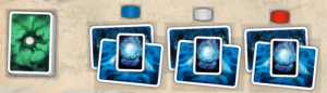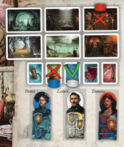 Chacune de ces combinaisons sont posées faces cachées en pile devant un Medium (avec un jeton à la couleur du Medium par-dessus). Ces combinaisons sont la clé qui conduiront à la révélation du Coupable, de l’endroit où il se trouvait au moment du crime, et de ce qu’il y faisait.