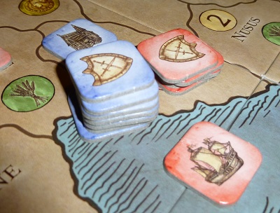 On commence la partie avec tous les jetons Villes et Cités (x4) dans notre stock de jetons disponibles. On débute également avec 6 jetons Armée et 2 jetons Navires sur notre plateau personnel. Tous les jetons restants sont mis de côté et forment la réserve générale, avec les cartes provinces neutres et la pile des 16 cartes amélioration.