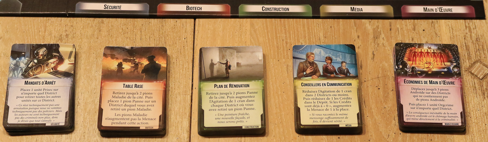 L’aspect production-économie du jeu est très simple : les dix quartiers du jeu peuvent produire un à deux types de ressources lors de la phase de production pour peu qu’un des trois droïdes y soit présent et que le quartier ne soit ni en grève ni en panne. « Comment ? Les droïdes feraient donc des e-grèves ? Mais qu’est-ce qui m’a foutu un matériel pareil ? » Mais non, mais non, vous rassurerai-je : les droïdes ne font pas grève mais si le quartier est très agité par des manifestations, la production est bloquée.
