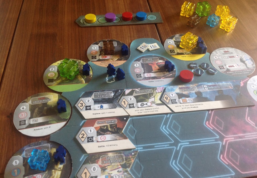Dans New Frontiers, les joueurs construisent des empires galactiques en sélectionnant, à tour de rôle, une action que tout le monde peut faire, mais seul le joueur qui choisit gagne le bonus de cette action, comme je le mentionnais ci-dessus.