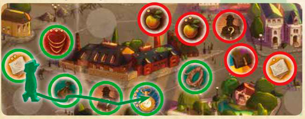 ► Le pion vert « Bande » débute sur la petite place pavée au centre du plateau. Si vous décidez de jouer l’action « roder » vous pourrez le déplacer sur les cases du plateau, selon quelques contraintes, afin de récupérer un des 4 premiers jetons « objets » (ils sont visibles) que vous trouverez sur votre chemin. Si vous faites la fine bouche et ne prenez pas le premier jeton venu, on considère que vous prenez des risques, alors tous les jetons que vous décidez d’ignorer iront droit dans votre dossier de police. Attention, votre réserve est quant à elle limitée et si vous prenez un jeton tandis qu’elle est pleine, il faudra déplacer un jeton dans votre dossier de police !