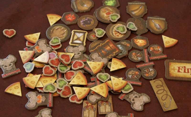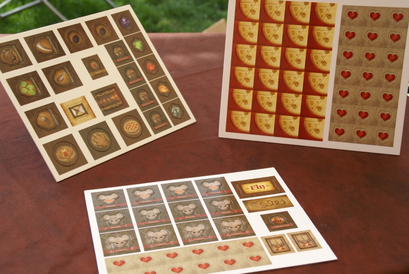 3 planches à dépuncher : jetons "herbe à chat, "fourchette", "déguisements, "souricières", "fromage" ou encore les marqueurs de points de vie…