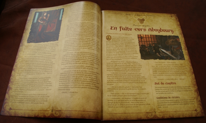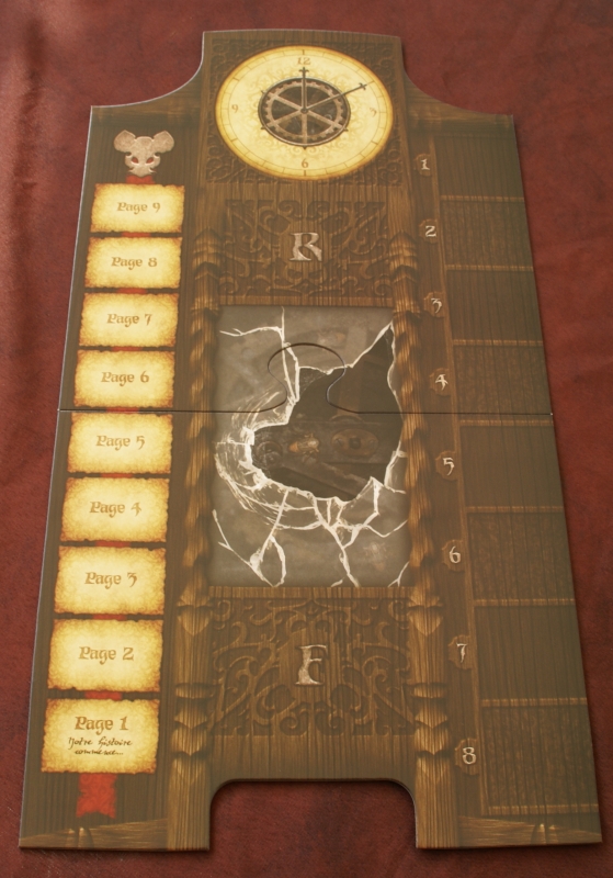 En effet chaque partie de Mice & Mystics est un "chapitre" tiré d'un conte général. Et chaque chapitre est divisé en "pages". Les pages avancent peu à peu en fonction des tirages de dés (quand on trouve du fromage). A chaque page, on se réfère au livre de conte pour lire ce qui se passe : il y a régulièrement des descriptions à lire haute voix un peu comme dans un jeu de rôle, ou un livre dont on est le héros.