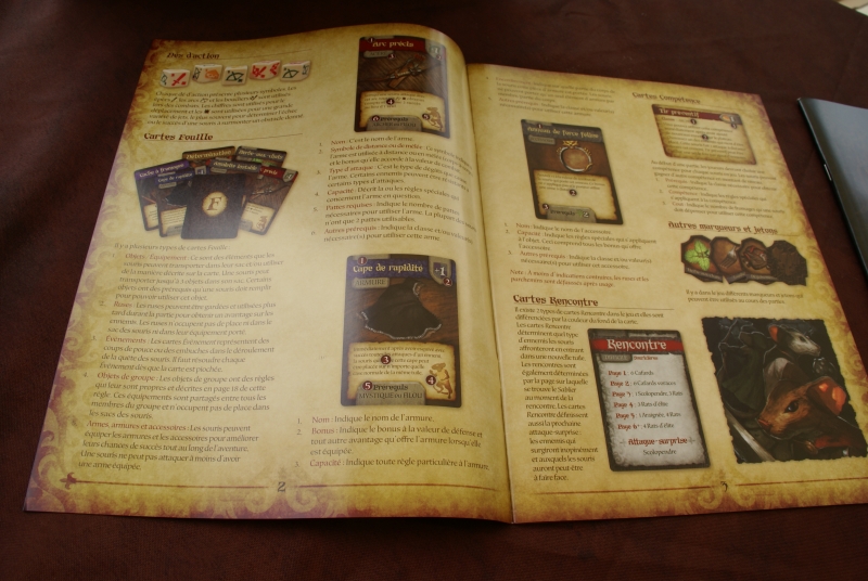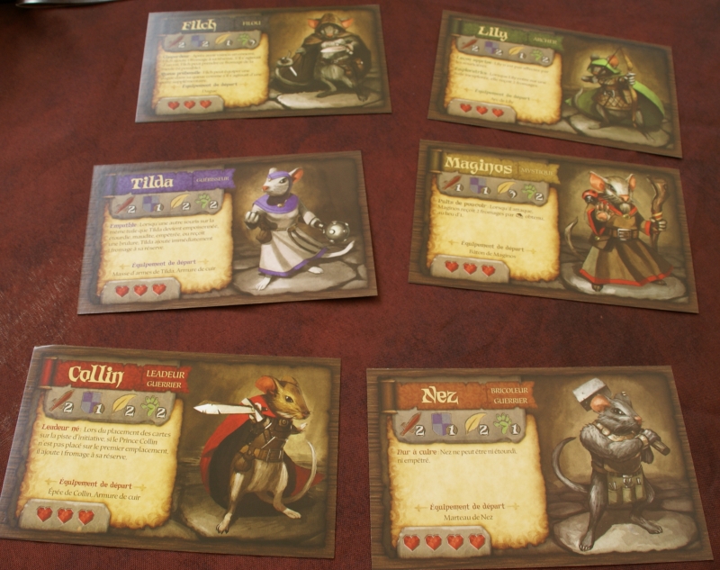 Les fiches personnagesVoici les cartes des héros ! En bas à gauche, Collin le leader, avec sa petite cape rouge et son épée. Sur ces cartes, on trouve le nom de la souris, sa classe (archer, guerrier, leader, bricoleur, magicien, guérisseuse, filou), ses valeurs de combat, de défense, de déplacement et de savoir (c'est à dire le nombre de dés que l'on va lancer), les talents uniques de chaque souris, l'équipement de base et le nombre de points de vie (sachant qu'on ne meurt pas quand on tombe à zéro, on est juste capturé ce qui n'est pas très marrant quand même puisqu'on perd tout l'équipement gagné).