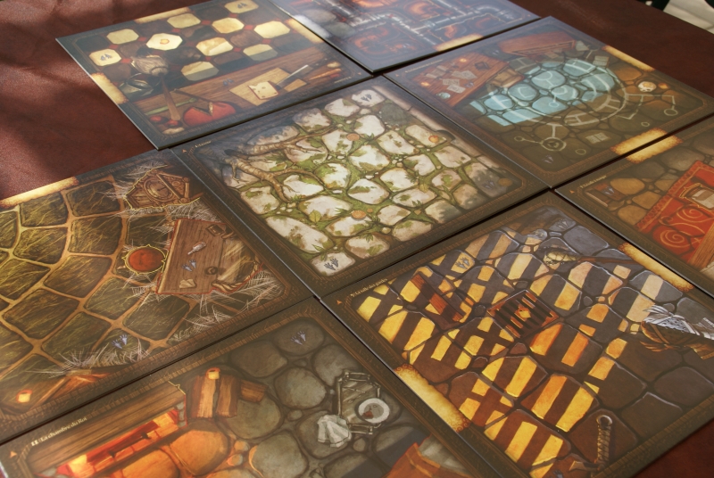 Voici les tuiles qui formeront -selon les scénar'- le plateau de jeu. Elles représentent les pièces du château et les salles souterraines. Elles sont recto/verso et cela est particulièrement intéressant dans ce jeu car il y a des passages qui permettent d'aller dans les sous-sols, autrement dit, on peut retourner les tuiles durant les parties et aller visiter les tunnels et autres égouts… Question beauté et robustesse, les tuiles sont d'une qualité irréprochable. Du très joli boulot !
