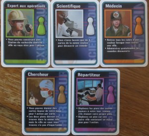 Parmi les cinq rôles proposés je choisi le Médecin, et ma fille choisie le Scientifique. Même pour une première partie on a déjà une idée de qui l’on veut incarner, c’est l’avantage d’avoir un thème clair. On ne maîtrise pas encore les subtilités du jeu et les trois autres nous semblent soit obscurs soit moins puissants. On apprend dans la douleur.