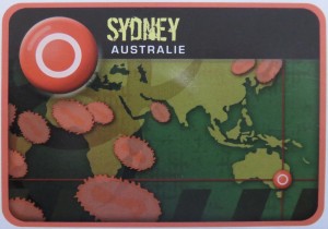 Et comme si c’était pas assez, au milieu des cartes « Propagation » il y a des cartes spéciales. De 4 à 6 selon le niveau de difficulté. Ces cartes « Épidémie » viennent pimenter vos parties pourtant bien rythmées. Elles vont apparaître plus ou moins régulièrement et augmenter la pression sur votre fragile équipe en augmentant le rythme de propagation des maladies. Ce sera l’occasion de voir entrer de nouvelles villes dans votre liste de lieux à surveiller en priorité. Parfois dans des régions jusqu’alors relativement épargnées. Et surtout à ce moment précis, on reprend toutes les cartes « Propagation », on les mélange et on les replace sur le dessus de la pioche. Ce sont donc les même villes qui vont revenir inlassablement, avec les quelques nouvelles ajoutées. Infernal.