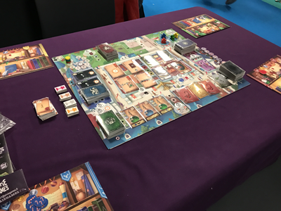 Le proto mystérieux de chez Pixie Games s’intitule provisoirement « Phoenix Cup ». Le proto est en cours de finalisation et le plateau attirait effectivement l’œil. Le jeu parle d’étudiants-sorciers qui acquièrent des points de savoir… à suivre !