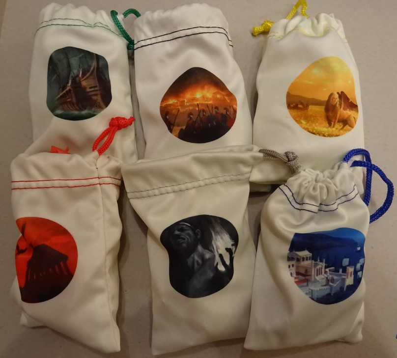 Néanmoins, moi, trier tous les bâtiments à chaque partie, ça m’agace. Voyons voir ce que l’on peut faire. Et commençons par avouer que sur ce coup là, je triche un peu. En effet, Matagot proposait en goodies à Cannes de petits sachets en toiles pour ranger le matériel de chacune des couleurs, et même les figurines Hadès. Alors bon, c’est joli, peut-être pas aussi pratique que des barquettes individuelles, mais je les ai, je les garde (et je gagne du temps). De toute façon, on vide tout devant soi au début de chaque partie et on a vite fait de tout remettre dans son sac.
